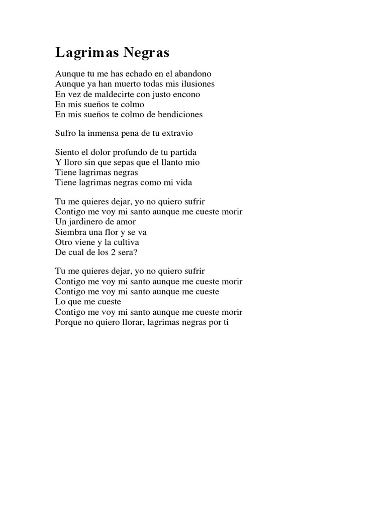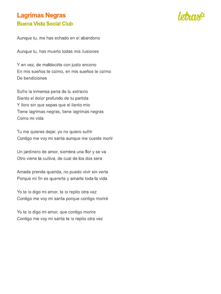 Lagrimas Negras Letra - Compay segundo guitarra guitarra electrica letra guitar pro partituras bajo cavaco teclado ukelele viola bateria armonica. Lagrimas Negras Letra / Canciones en espanol con letra y video.